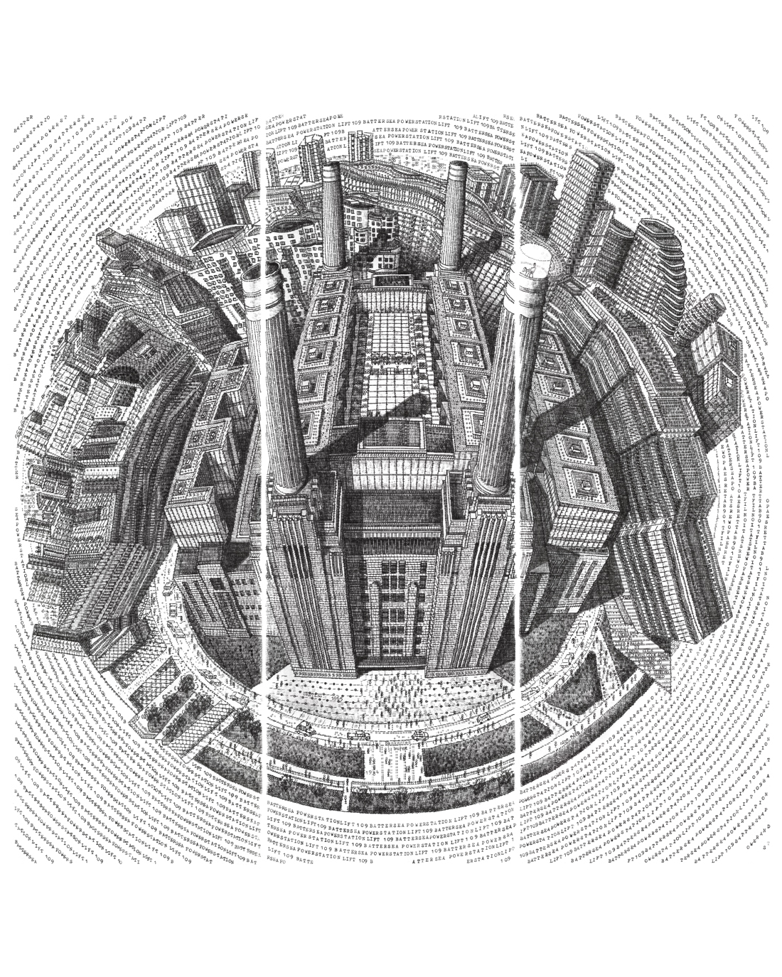 While not quite matching the 6 million bricks used to construct the power station, hidden within the intricacies of the drawing are messages that pay homage to the building’s 83-year history. This is the original artwork and measures 60cm x 60cm, although this artwork is framed with a window mount bring the outer dimensions to 76cm x 76cm. Each drawing is appended with a certificate of authenticity.