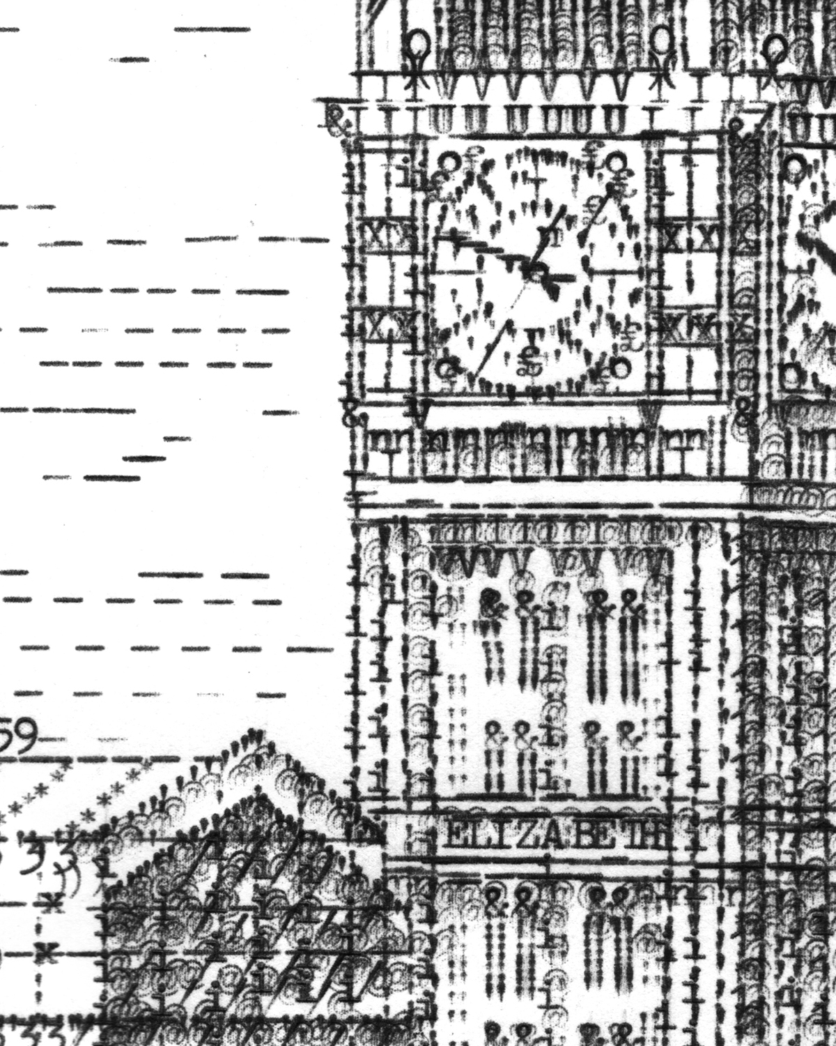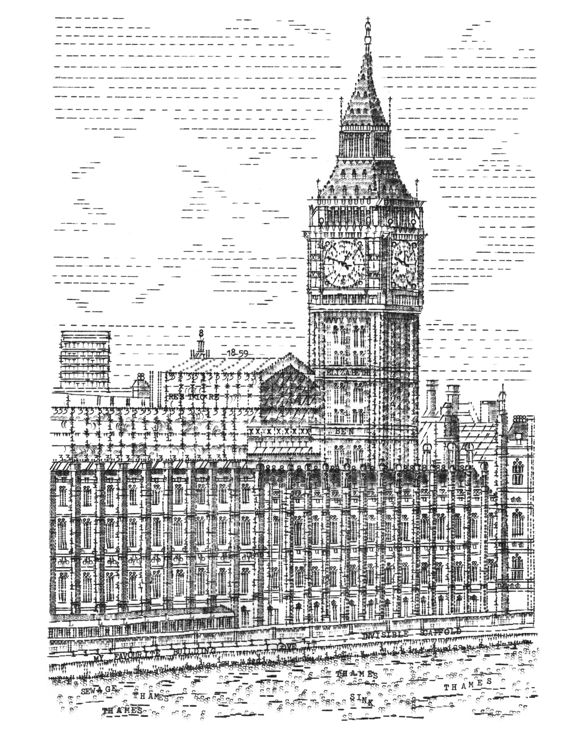 James visited the Thames Path opposite the Palace of Westminster in December 2021 where he typed out the above scene partly from his outdoor sitting, the drawing was then completed at his studio.