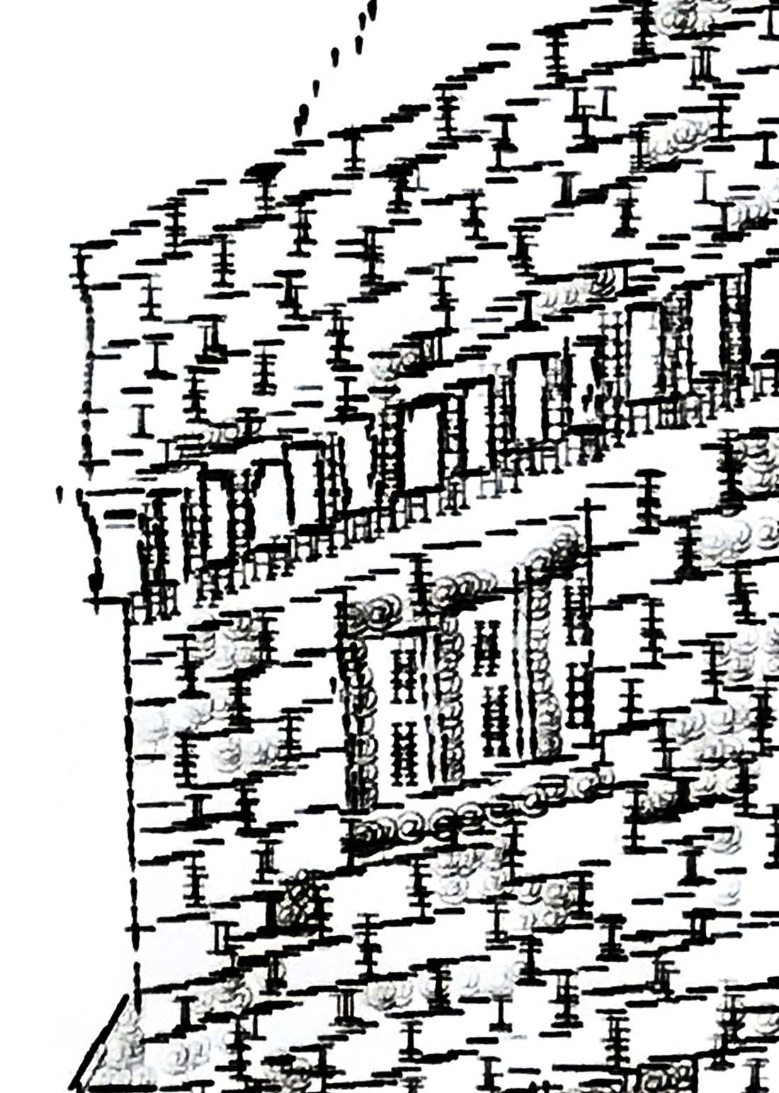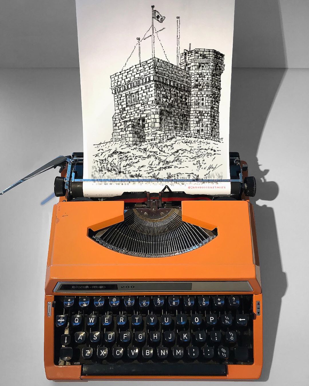 Constructed in 1898, the tower commemorates Queen Victoria’s Diamond Jubilee and also the discovery of Newfoundland. In 1920, one of the first wireless phone calls was made here. This drawing was typed on James’ “53 Oliver Courier Portable typewriter.