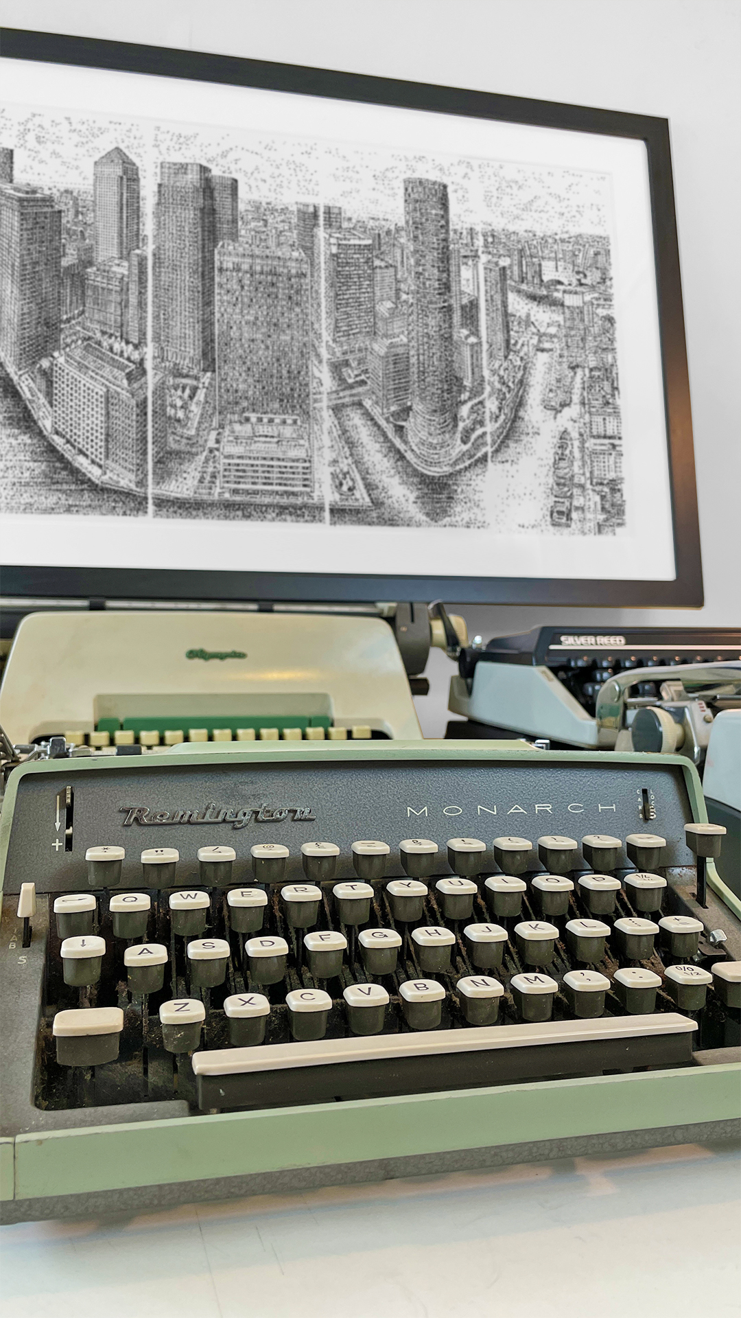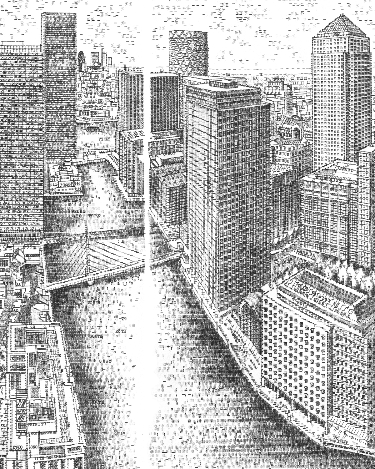 James visited the 42nd floor of South Quay Plaza on the Isle of Dogs. The drawing was then completed at his studio after his visit. The drawing took two weeks to complete and measures in at 110cm x 55cm (unframed). The original drawing was made from 5 pieces of paper bonded together into one single frame. This scene was typed on a 1970’s SilverReed typewriter.