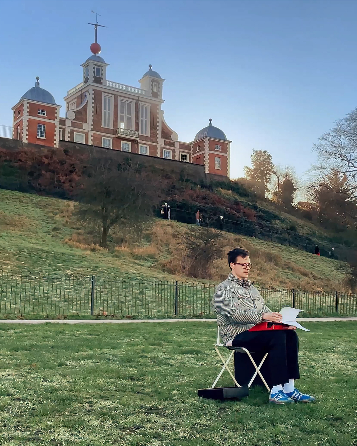James visited Greenwich Park in December 2021 where he typed out the above scene partly from his outdoor sitting, the drawing was then completed at his studio.