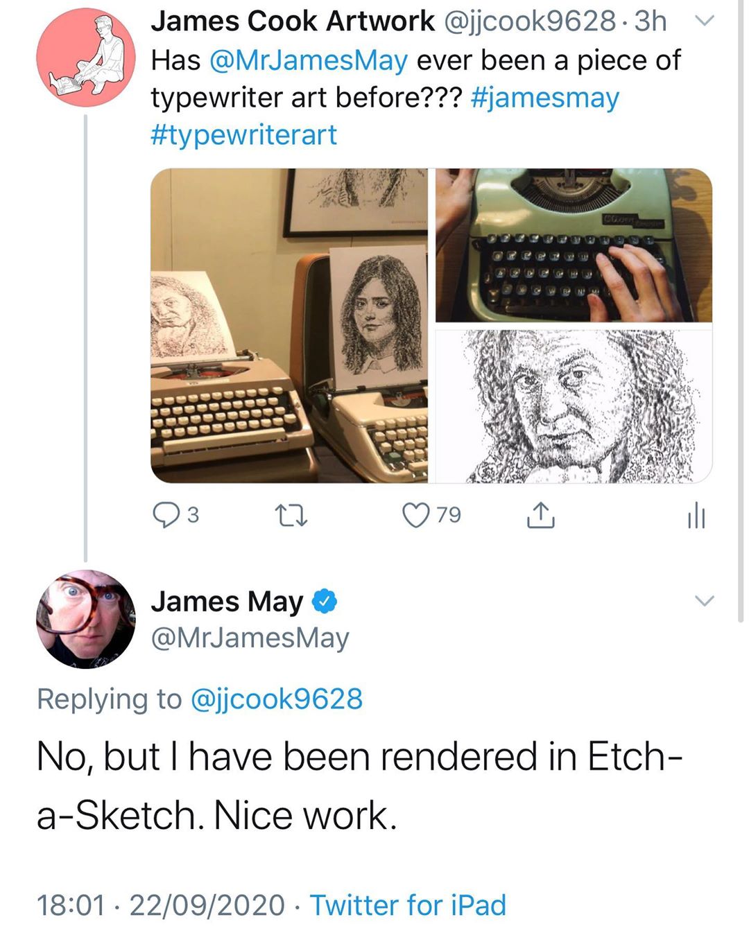This type-written piece was produced in December, 2016. This drawing was featured during a news segment with James on ITV’s Good Morning Britain. The artwork was commended by James May recently on Twitter.