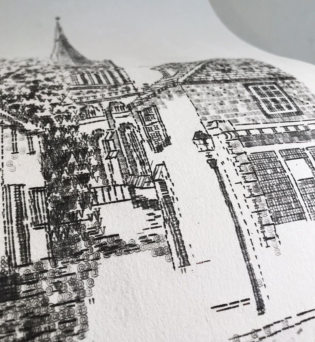 This architectural piece took two weeks to complete. The drawing is made from two A3 pieces of paper of portrait orientation bonded together. The drawing was produced in anticipation of James’ first ever exhibition of typewriter art. The location for the exhibition is the subject matter of the Guildhall featured in the artwork. The drawing was typed on the “70’s Olympia SG3 A3 typewriter.